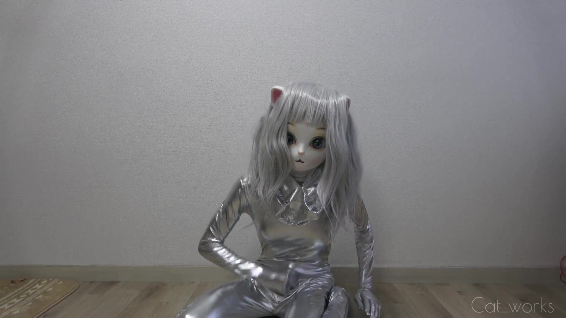 銀色ゼンタイと白ゼンタイを重ね着した着ぐるみネコがオナニー