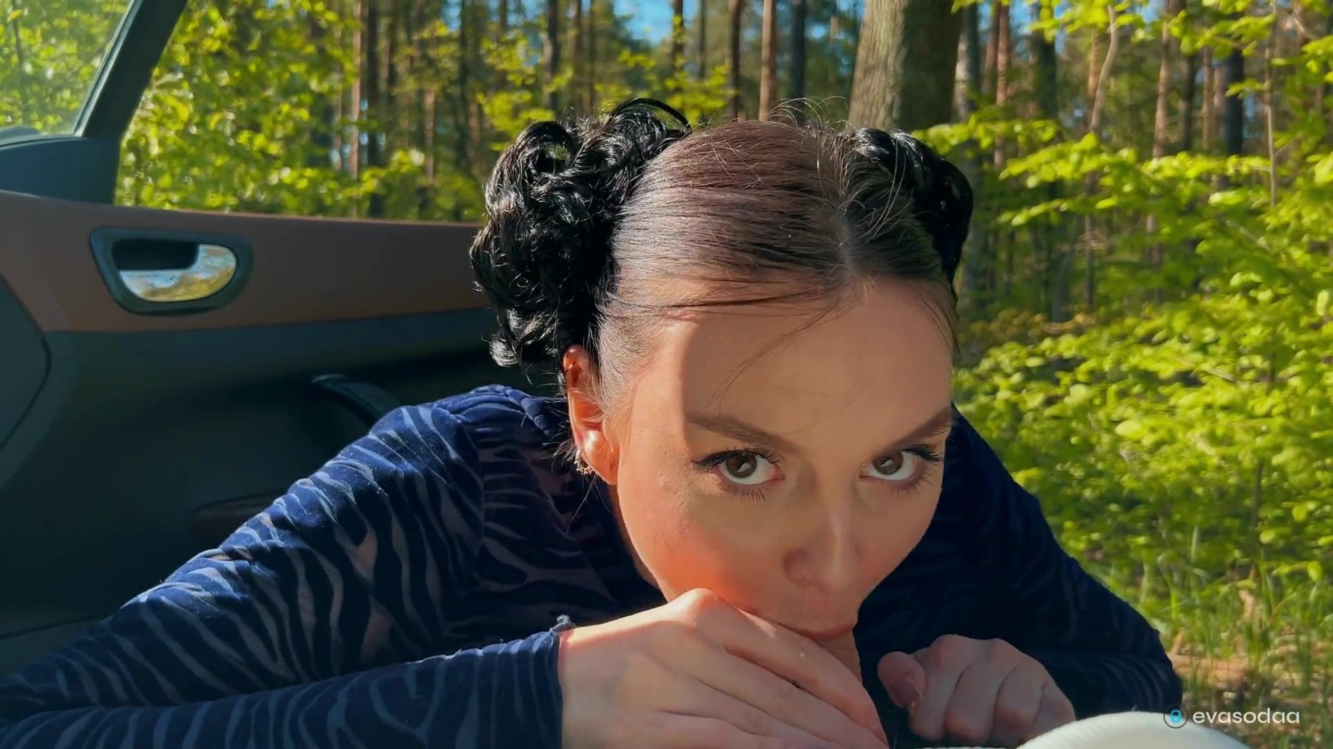 Fræk brunette i strømper onanerer i bilen foran en fremmed