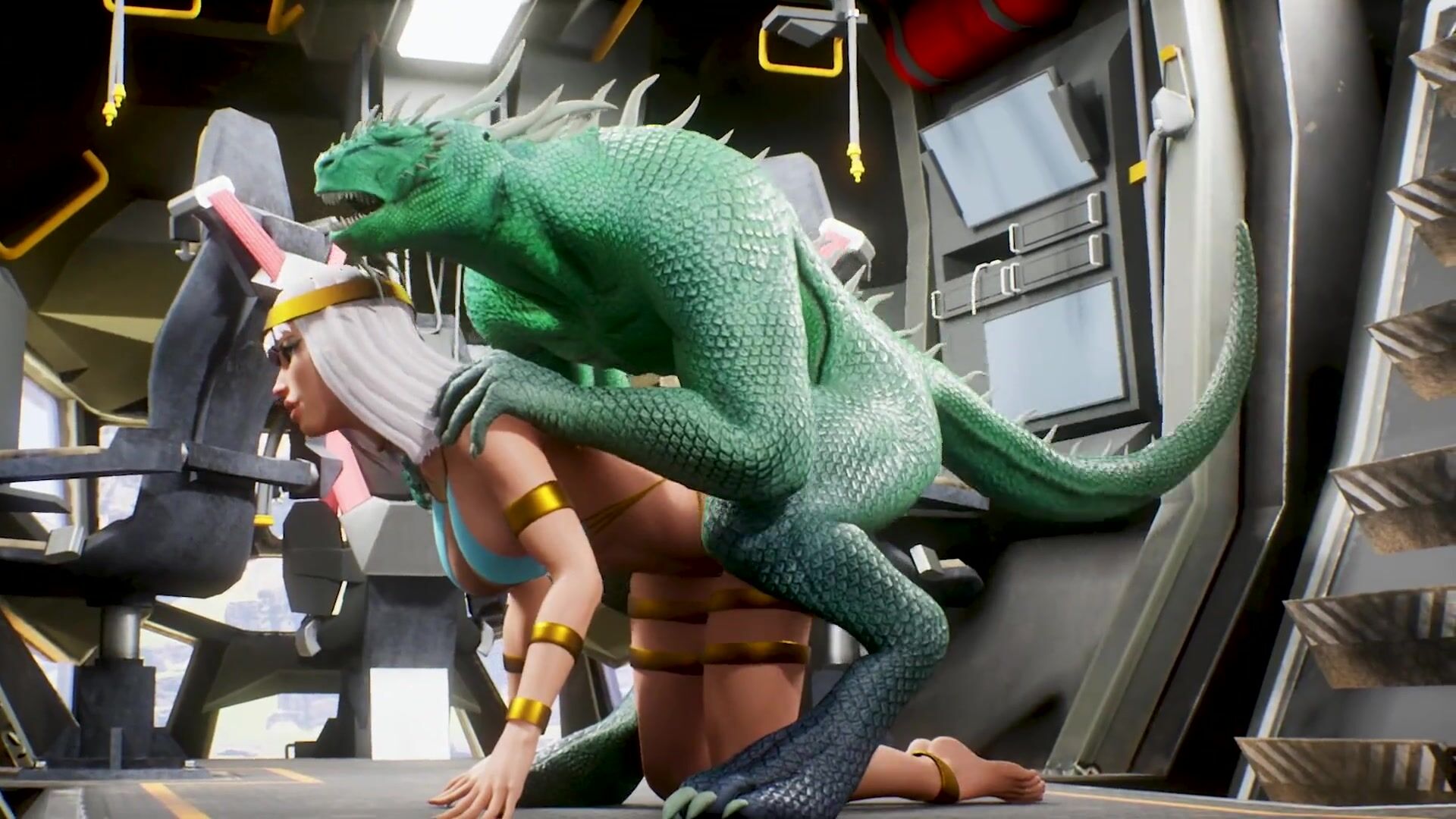 green furry dragon with a double thin dick entered the spaceship and fucked the beauty in all holes