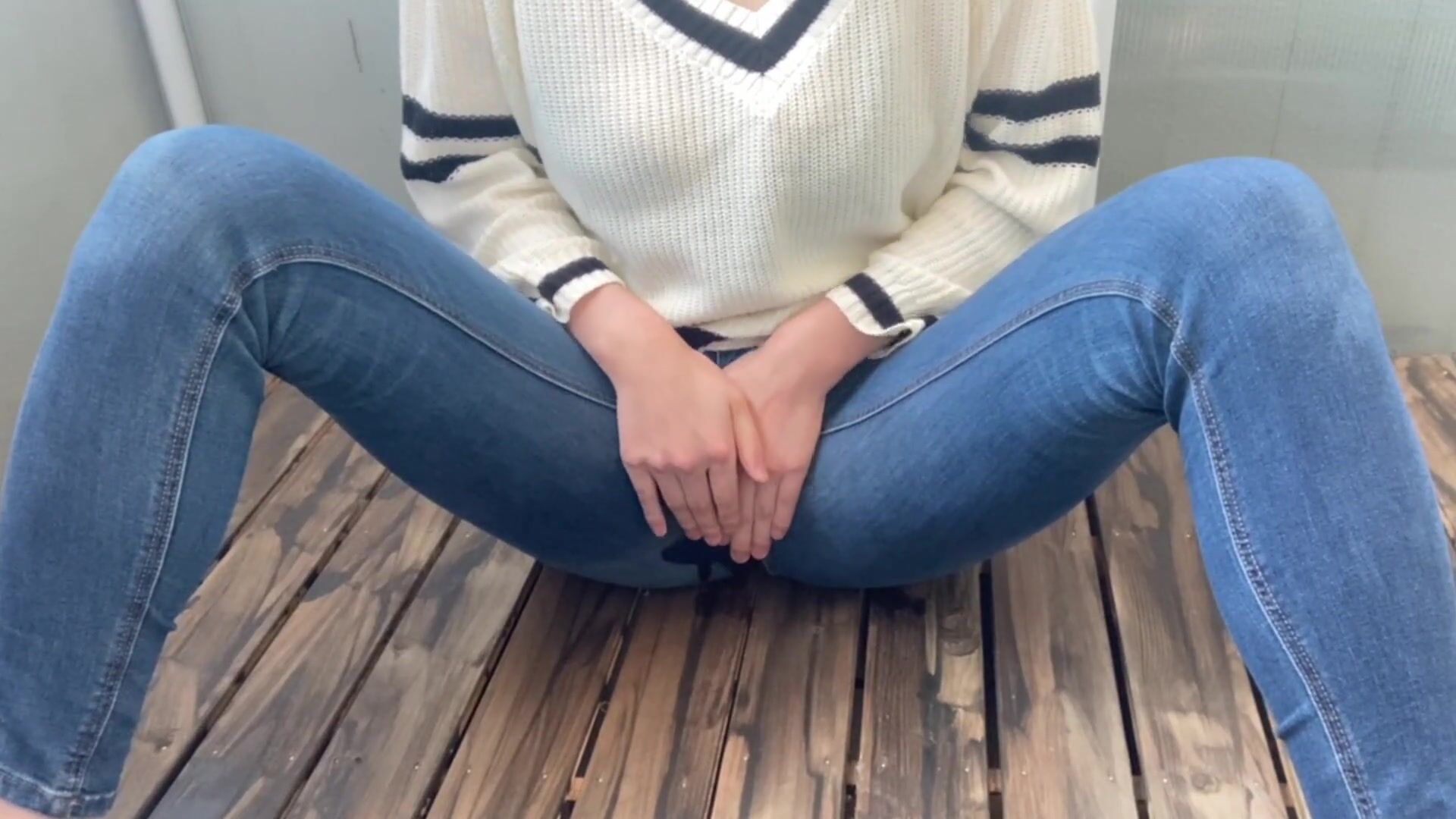 The wife of jeans waiting on the veranda in the cold can't stand the pee and pees little by little