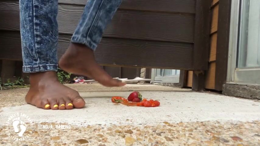 Kati Crush,with high heels and ballerina shoes and barefoot Easter eggs and strawberries are trample