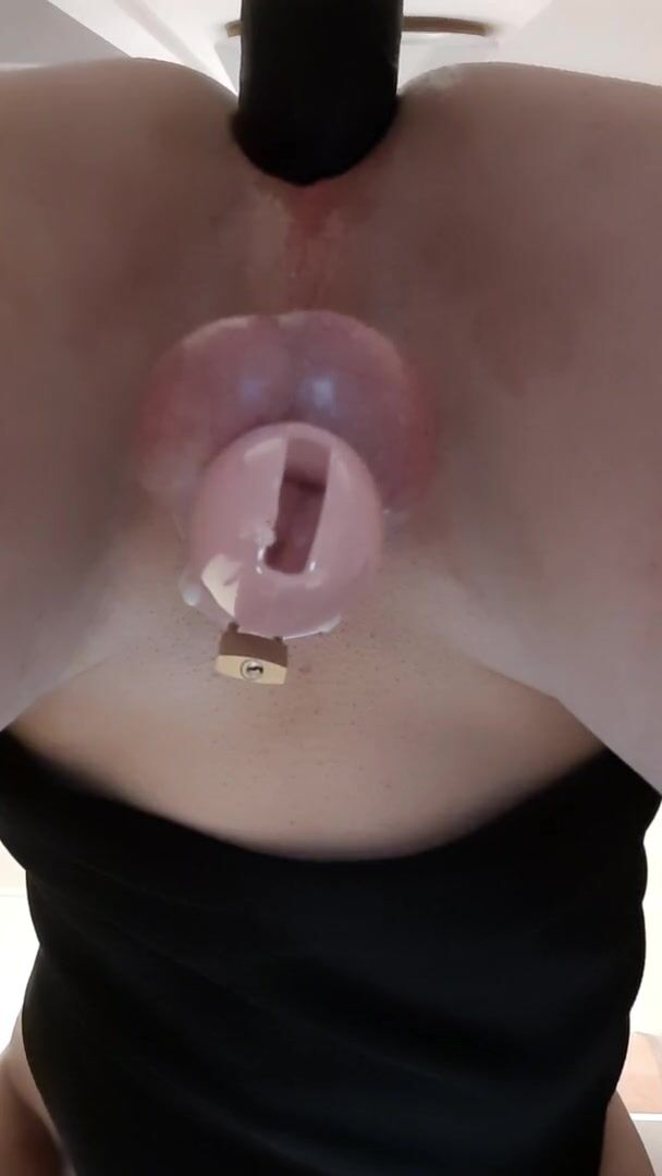 Caged sissy plays with ass to get off