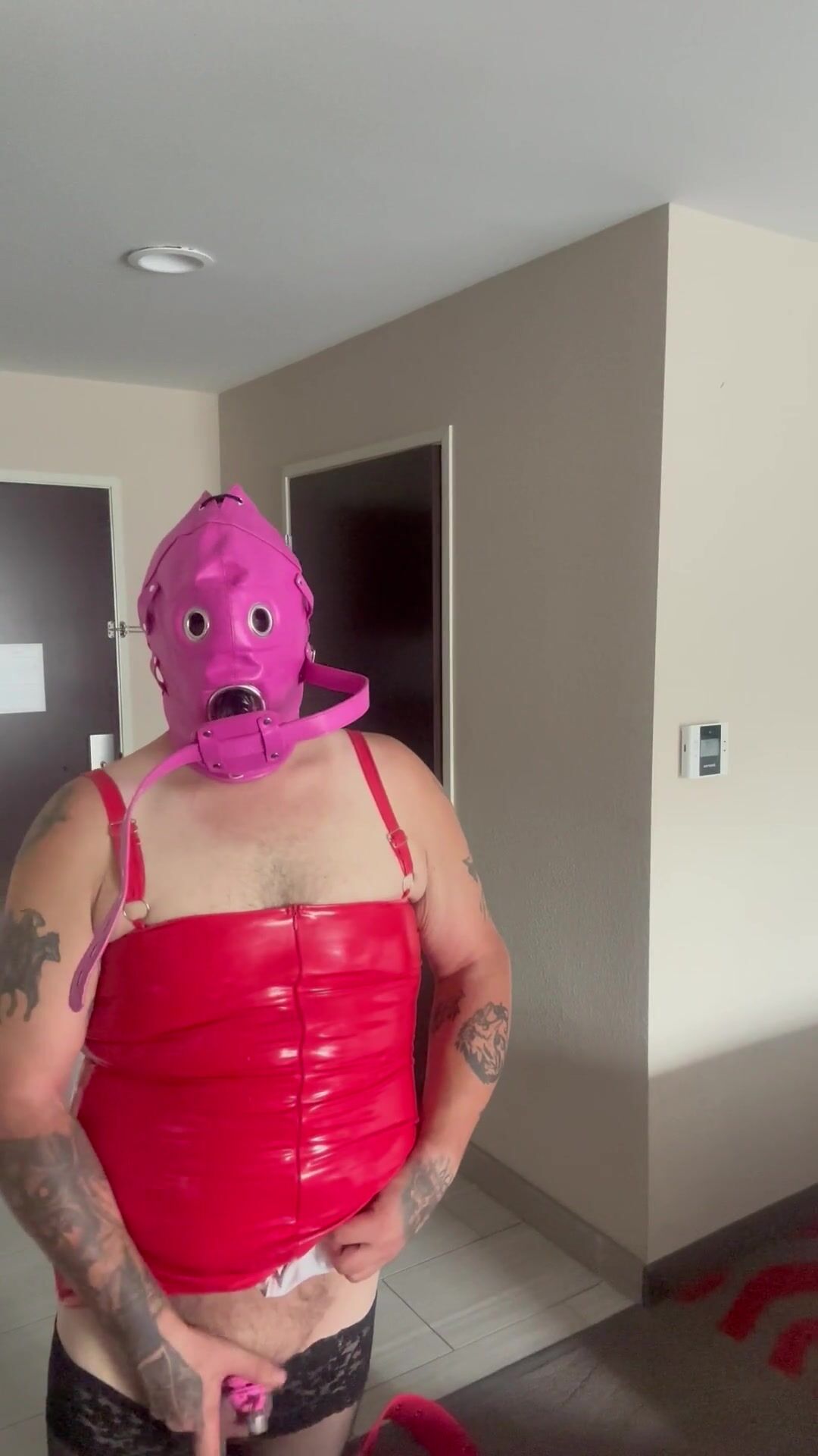 Tiny Bondage Slut Trying To Get Off In A Latex Armbinder And Breath Play Hood