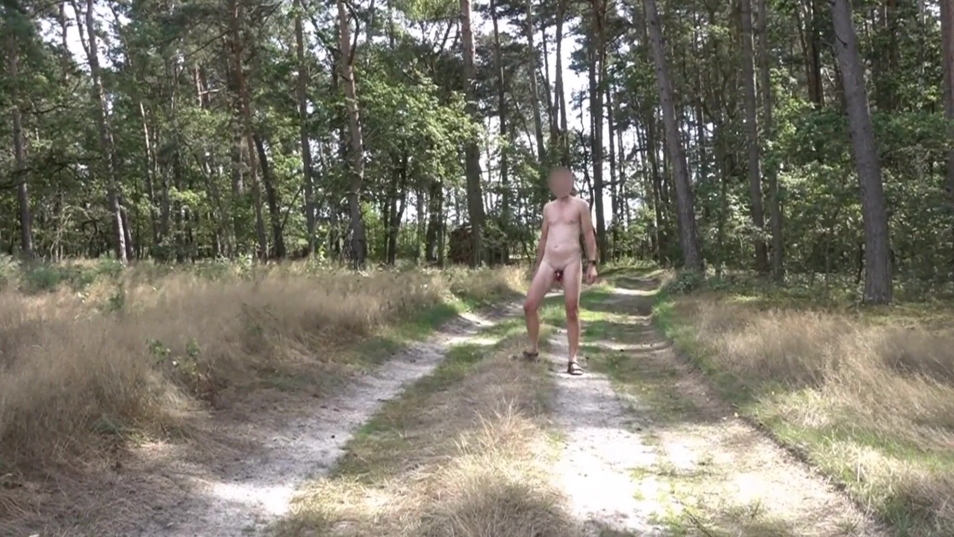 Naked but enclosed in a chastity cage walks through the forest