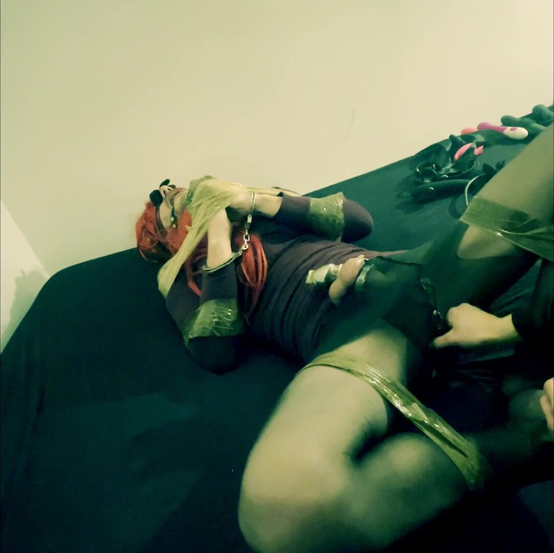 Sissy tied up, mistress teases her in chastity and plays with her ass