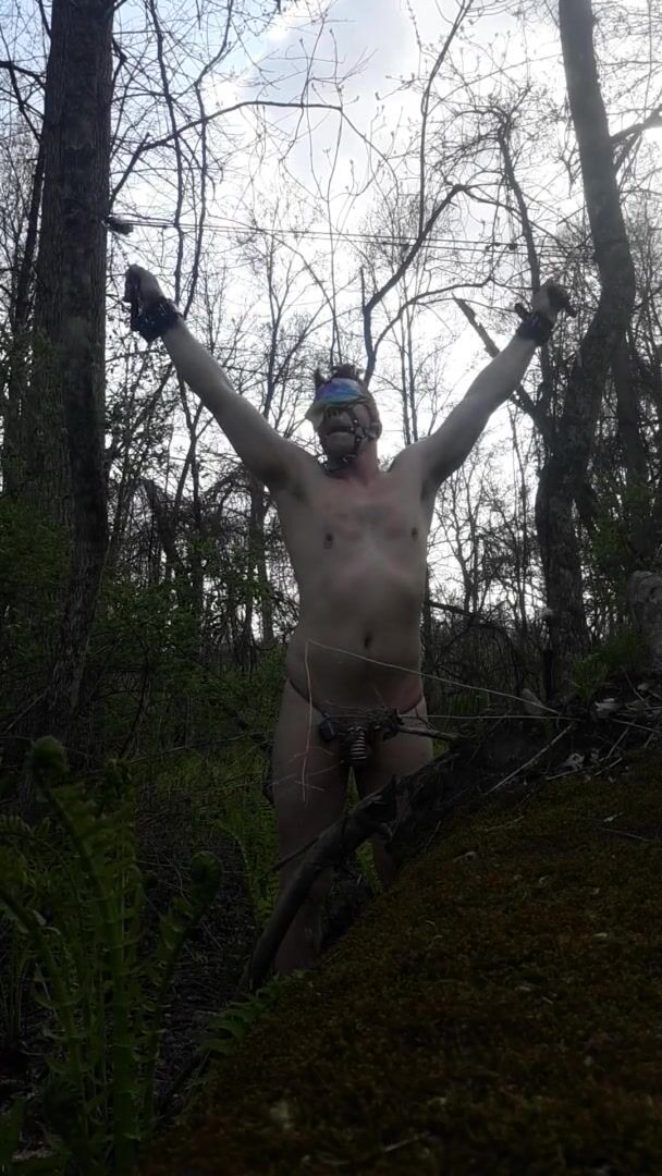 Self bondage and anal torment in the woods for sub in chastity