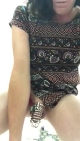 Cross-dressing sissy stuffs ass with cock in public restroom