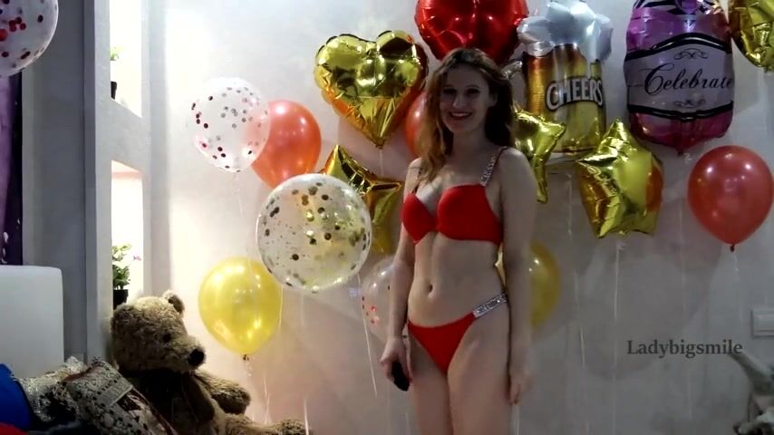 woman in red lingerie & panties dancing near balloons in her birthday