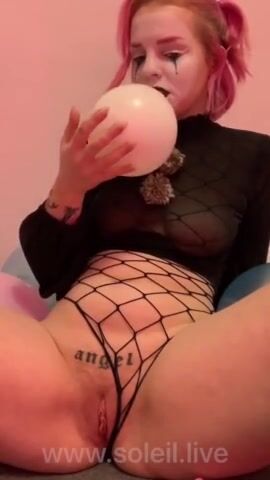naughty clown girl blows up balloons & stuffs them in her pussy
